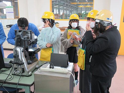 当日は、焼鈍、切断、矯正などの製造工程を見学していただいたほか、検査室では最高倍率2500倍の業務用顕微鏡を使用し、和紙やマスク、髪の毛などを観察しました。普段目にすることのない微細な世界に、児童の皆さんは大変興味深そうな様子でした。